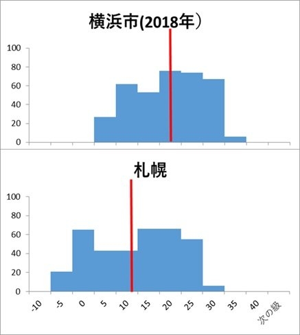 2018年の横浜の平均気温は17.4度、札幌は9.5度(図中の赤線)でした。これをもって「札幌は横浜より寒い」ということもできるでしょう。