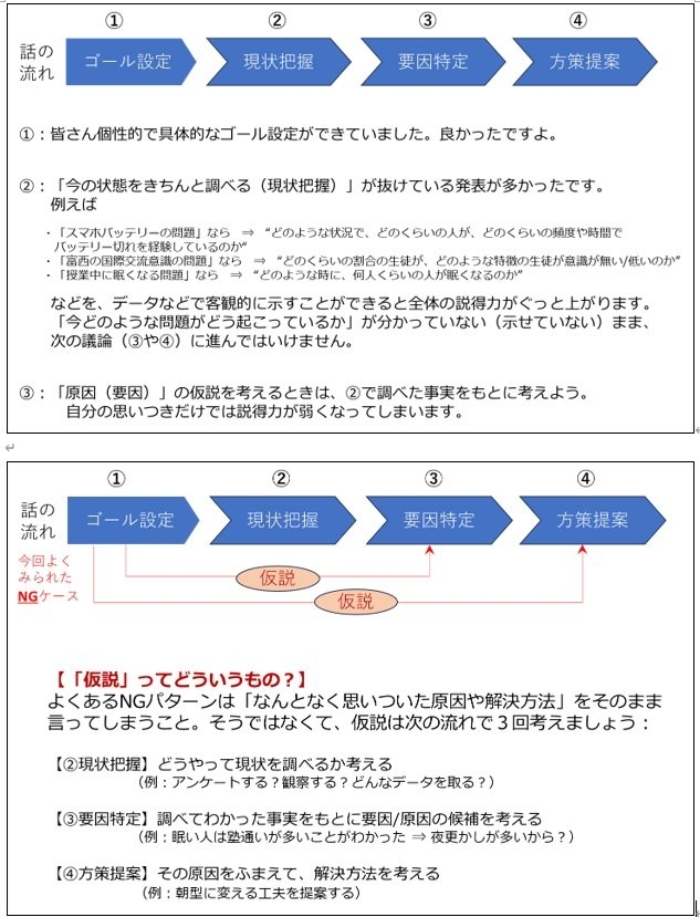 2年間かけて行う研究の中間発表に立ち合い、2年生全員に対する「問題解決の考え方」のフォローアップ(アドバイス、フィードバック)にこちらの資料を使いました。