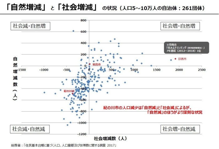 左下に赤字で示されたものが「紀の川市」です。両軸とも減少しているのですが、自然減の影響のほうが大きいことが分かります。