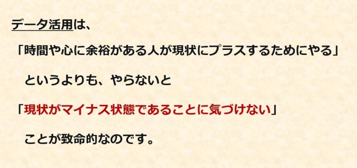私が多くの現場に触れて感じるのは、データ活用をやってことによるプラス要素もありますが、それ以上に「やらなかったことによるマイナス要素」のほうが遥かに大きいことです。